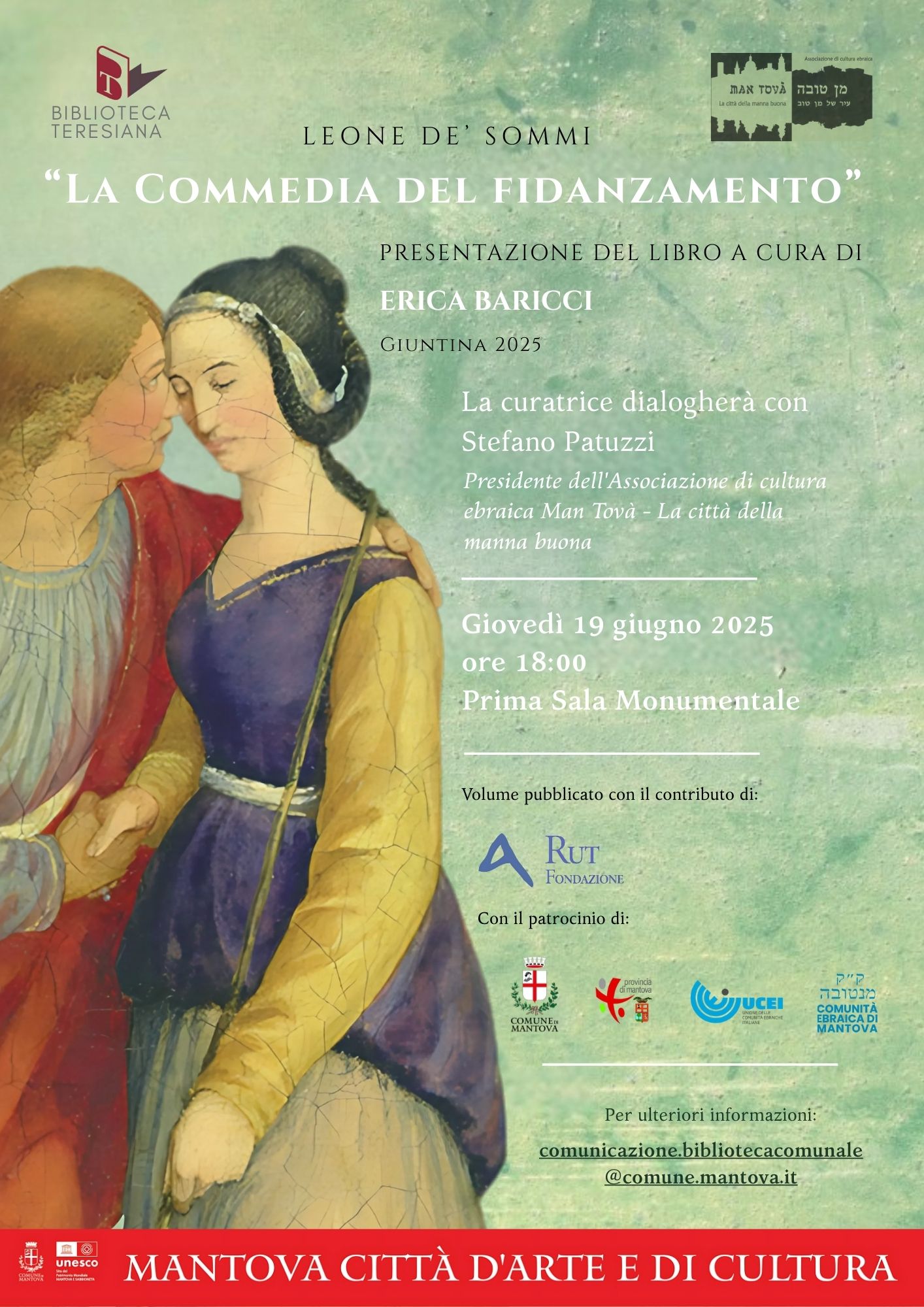 Il Comune di Mantova, in collaborazione con l’Associazione di cultura ebraica “Man Tovà - La città della manna buona”, organizza nella giornata di giovedì 19 giugno 2025, presso la Biblioteca Comunale Teresiana, la presentazione del volume “Leone de’ Sommi. La commedia del fidanzamento” a cura di Erica Baricci, pubblicato dalla casa editrice Giuntina nel 2025 con il contributo di Fondazione Rut e con il patrocinio di Comune di Mantova, Provincia di Mantova e UCEI - Unione delle Comunità Ebraiche Italiane.